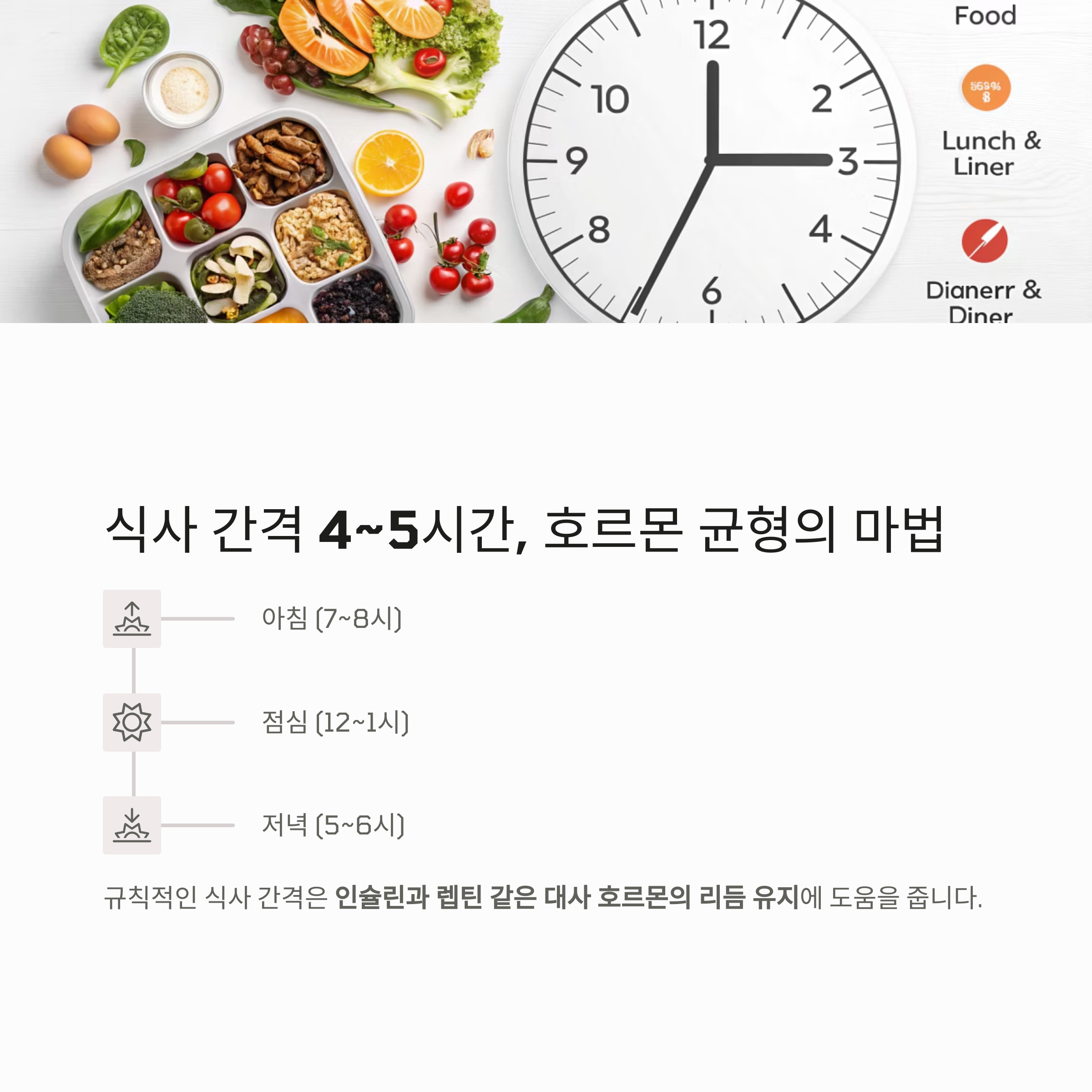 규칙적인 식사 간격은 인슐린과 렙틴 같은 대사 호르몬의 리듬 유지에 도움을 줍니다.