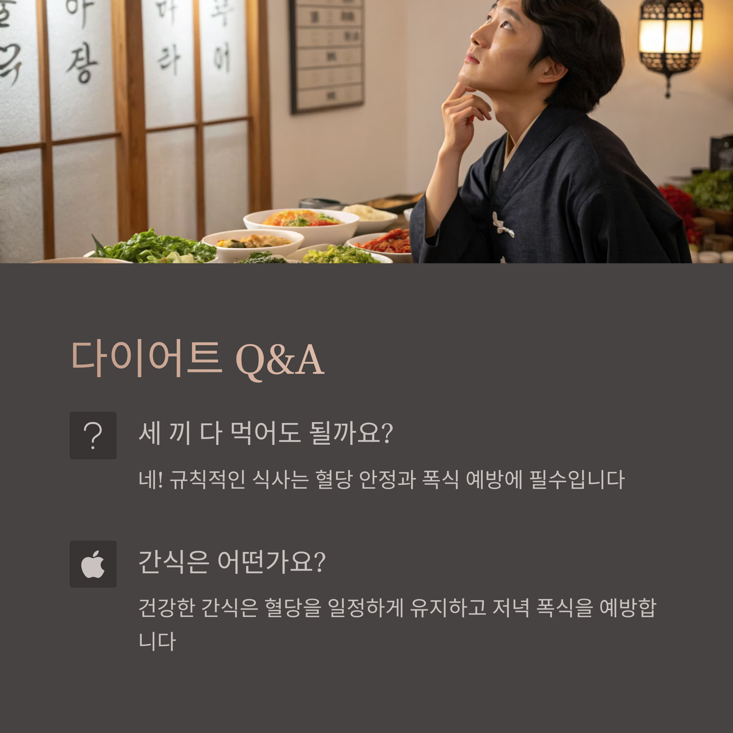 - A: 아닙니다. 오히려 규칙적인 식사는 혈당 안정과 폭식 예방에 필수입니다.