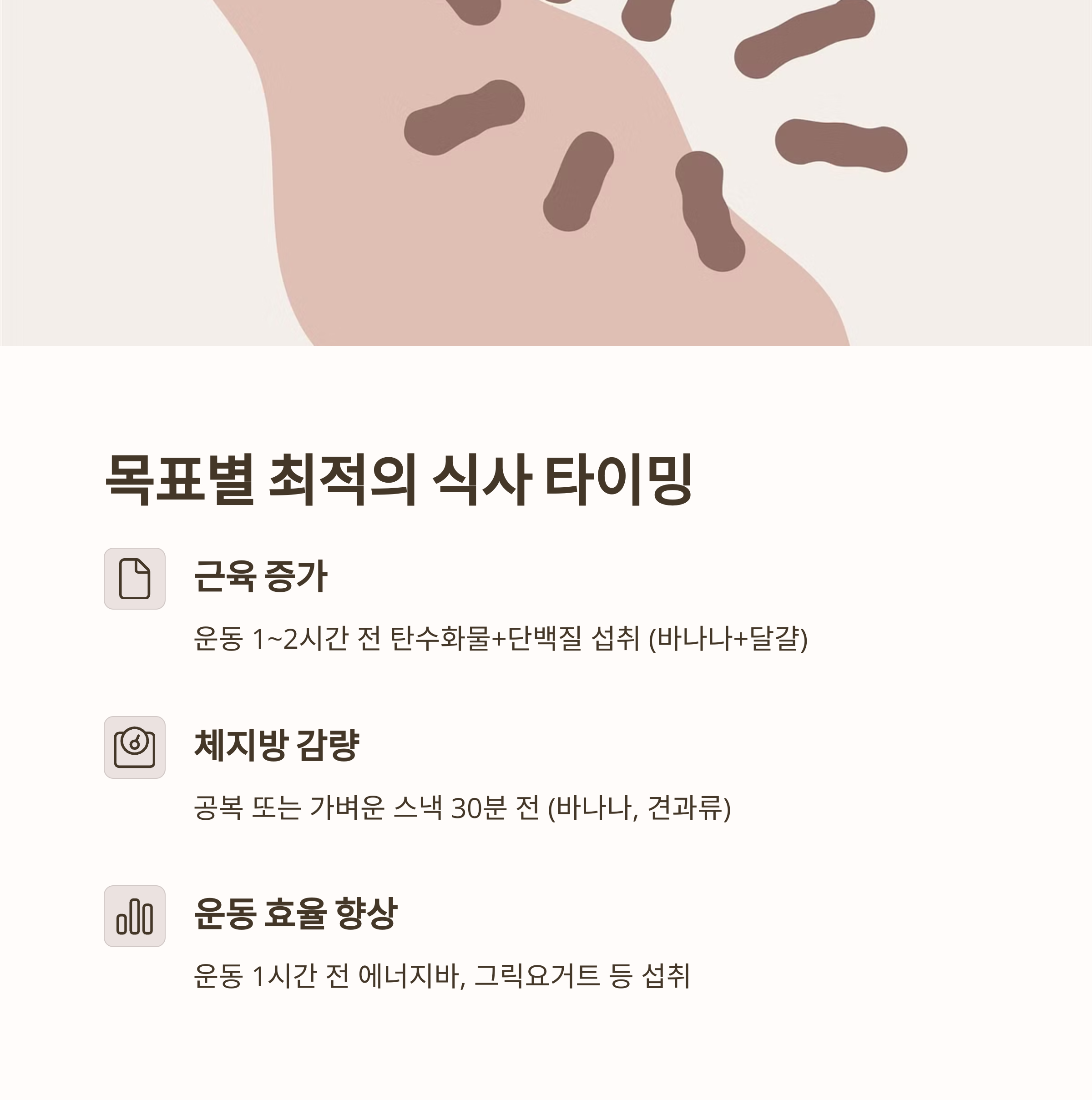 | 근육 증가 | 운동 1~2시간 전 | 탄수화물+단백질 (예: 바나나+달걀) |