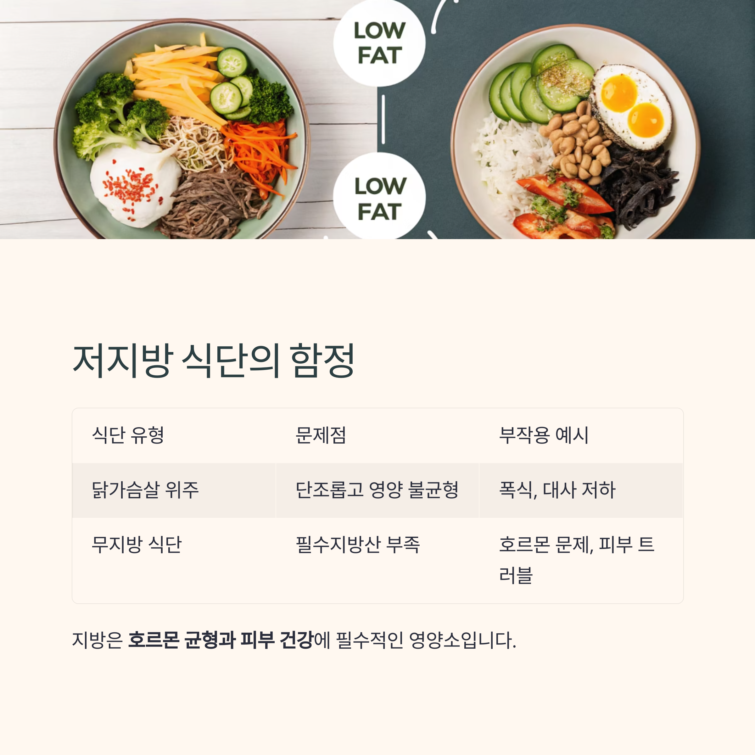 | 무지방 식단 | 필수지방산 부족 | 호르몬 문제, 피부 트러블 |
