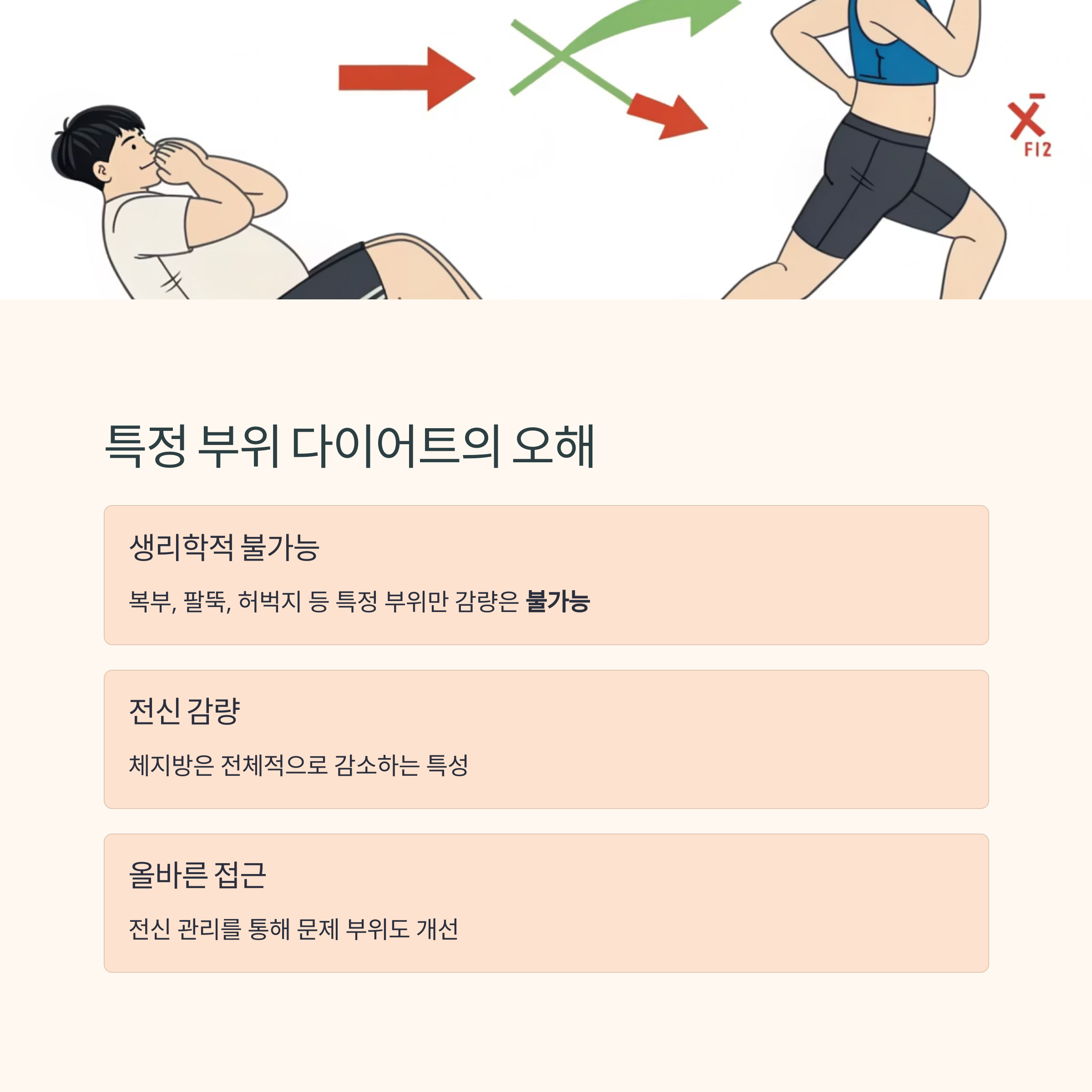 복부, 팔뚝, 허벅지 등 특정 부위만 살을 빼겠다는 생각은 생리학적으로 불가능합니다.