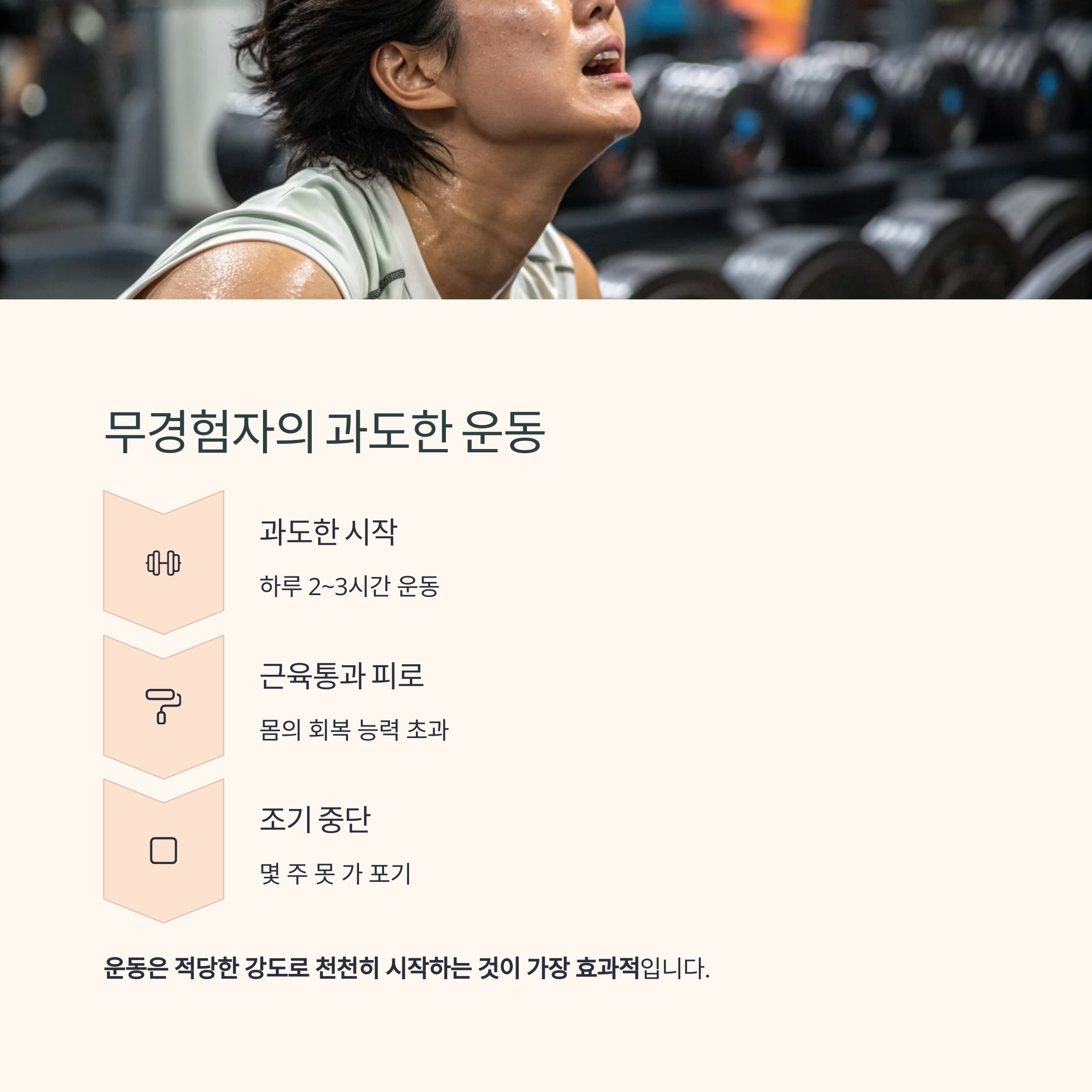운동은 적당한 강도로 천천히 시작하는 것이 가장 효과적이며 지속 가능성도 높습니다.