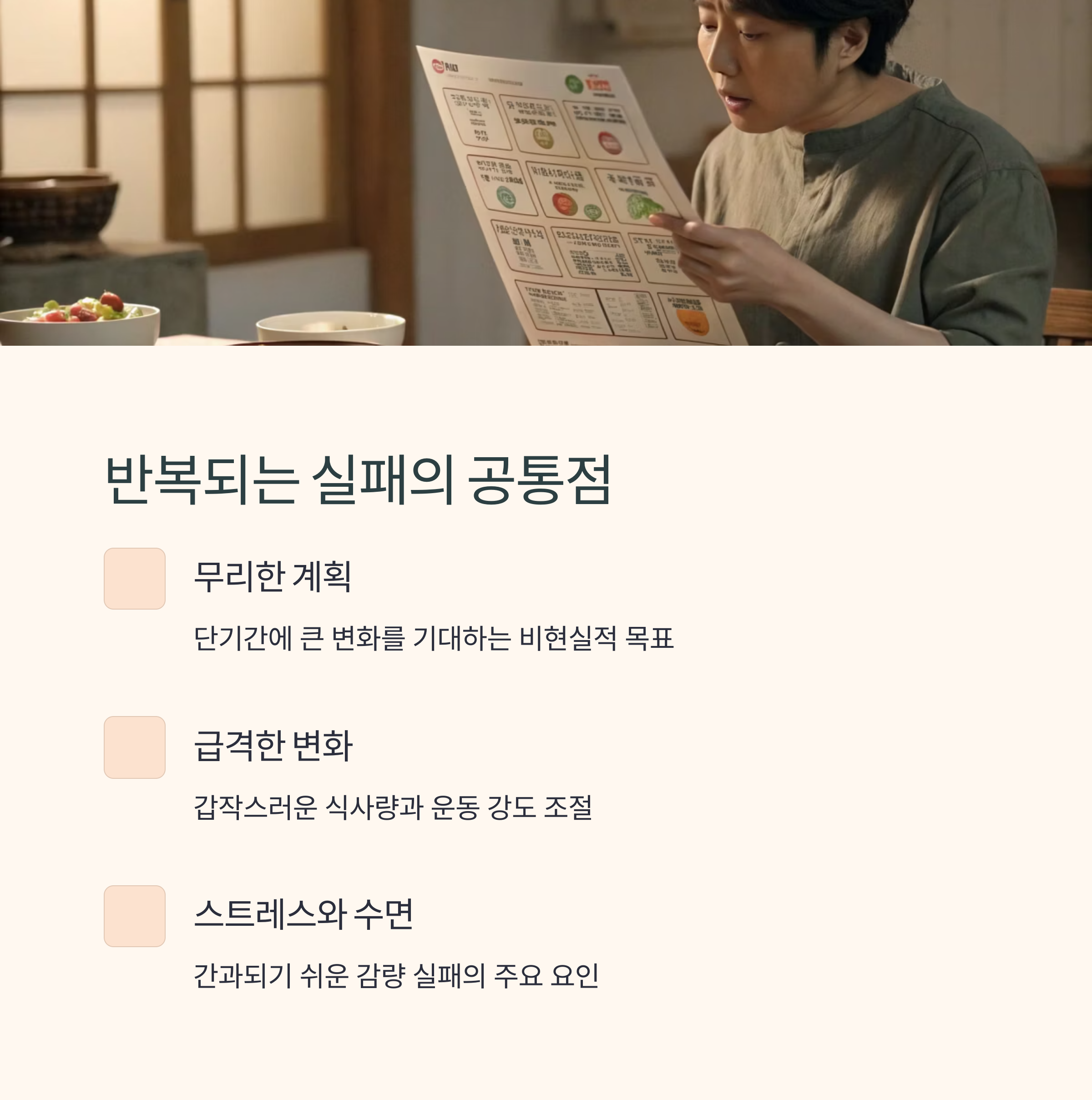 또한, 스트레스와 수면 문제도 감량 실패를 부추기는 주요 요인으로 작용합니다.
