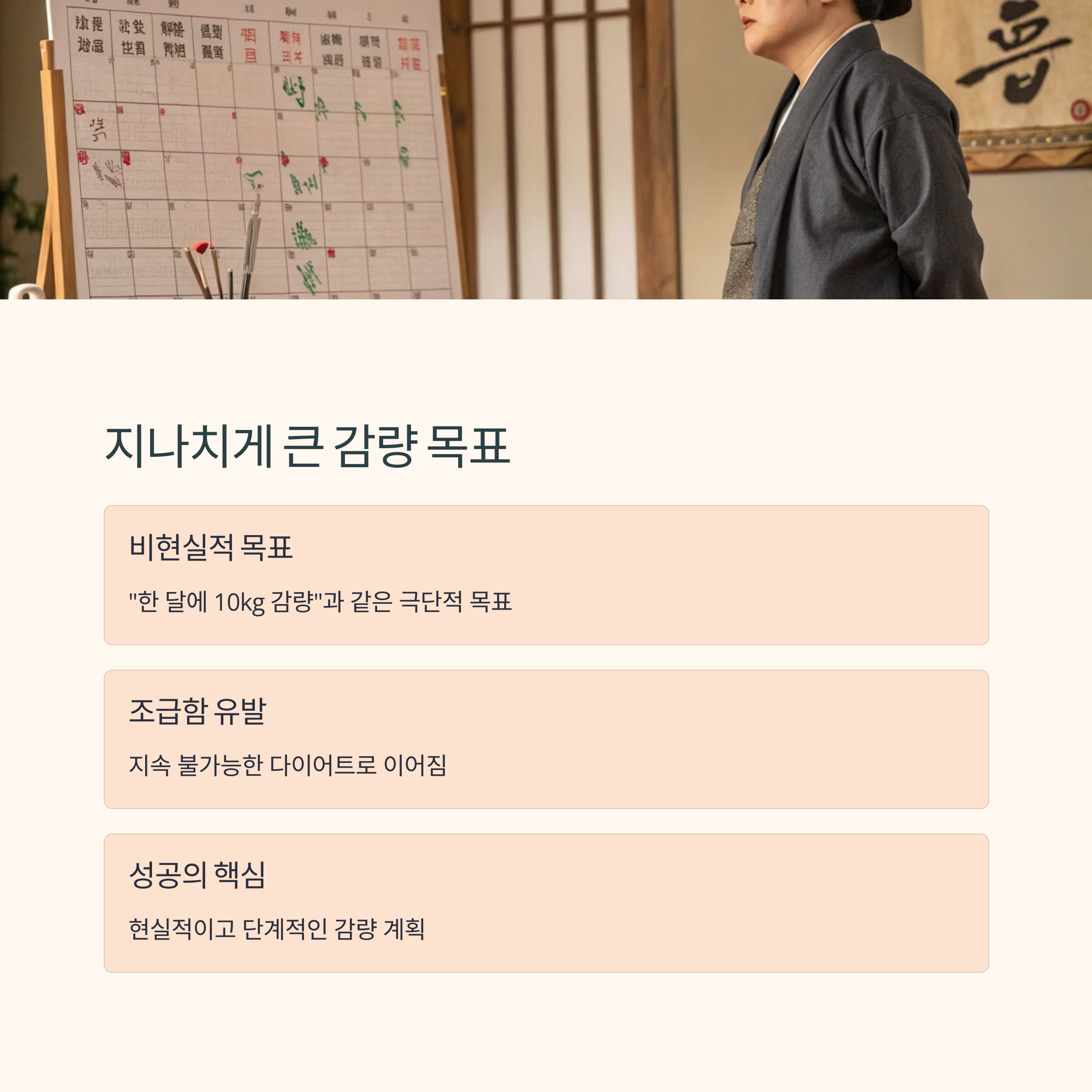 극단적인 목표는 조급함을 불러오고, 결국 지속 가능하지 않은 다이어트를 만들기 때문입니다.