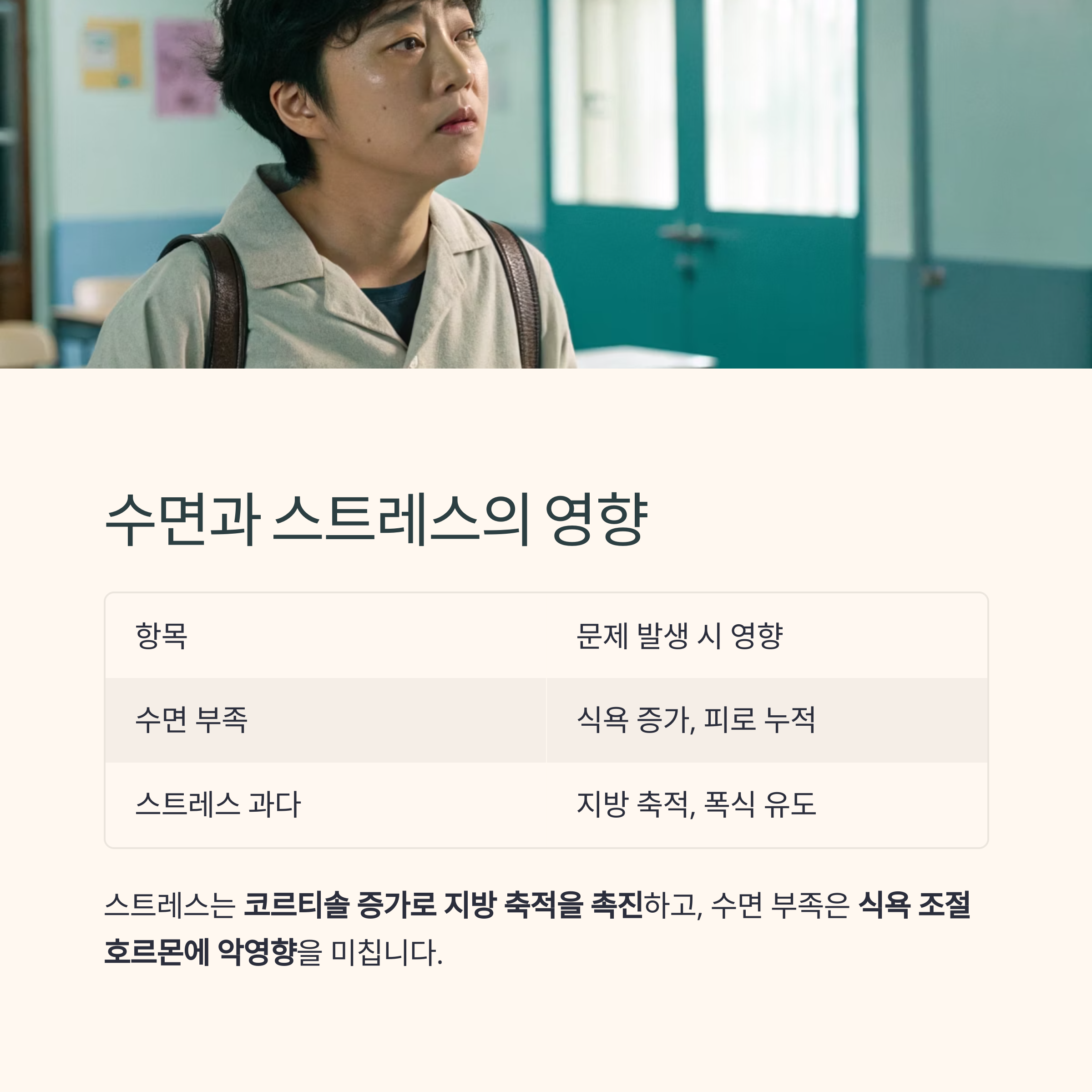 | 수면 부족 | 식욕 증가, 피로 누적 |