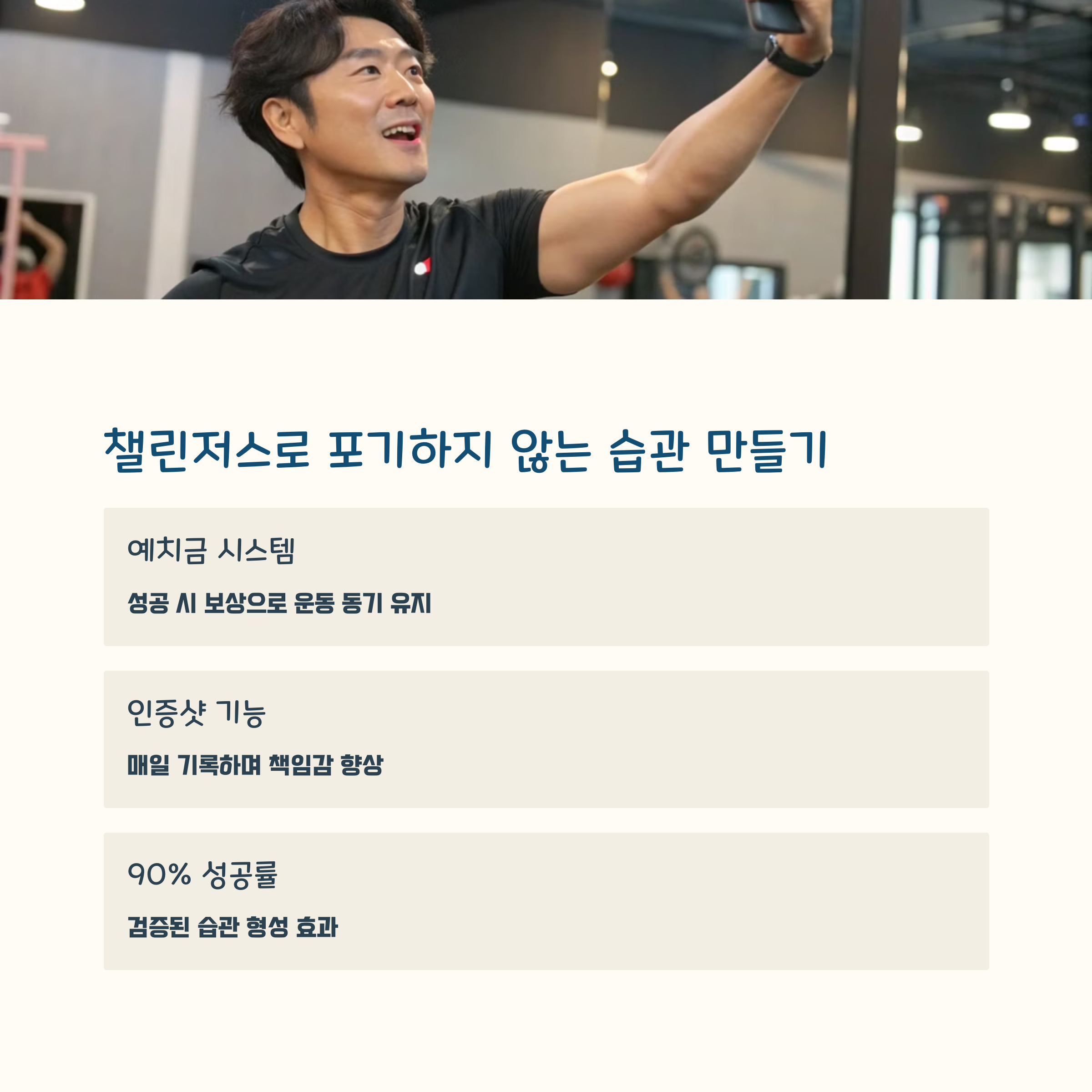 자신만의 운동 목표를 설정하고 매일 인증을 통해 지키는 구조로,