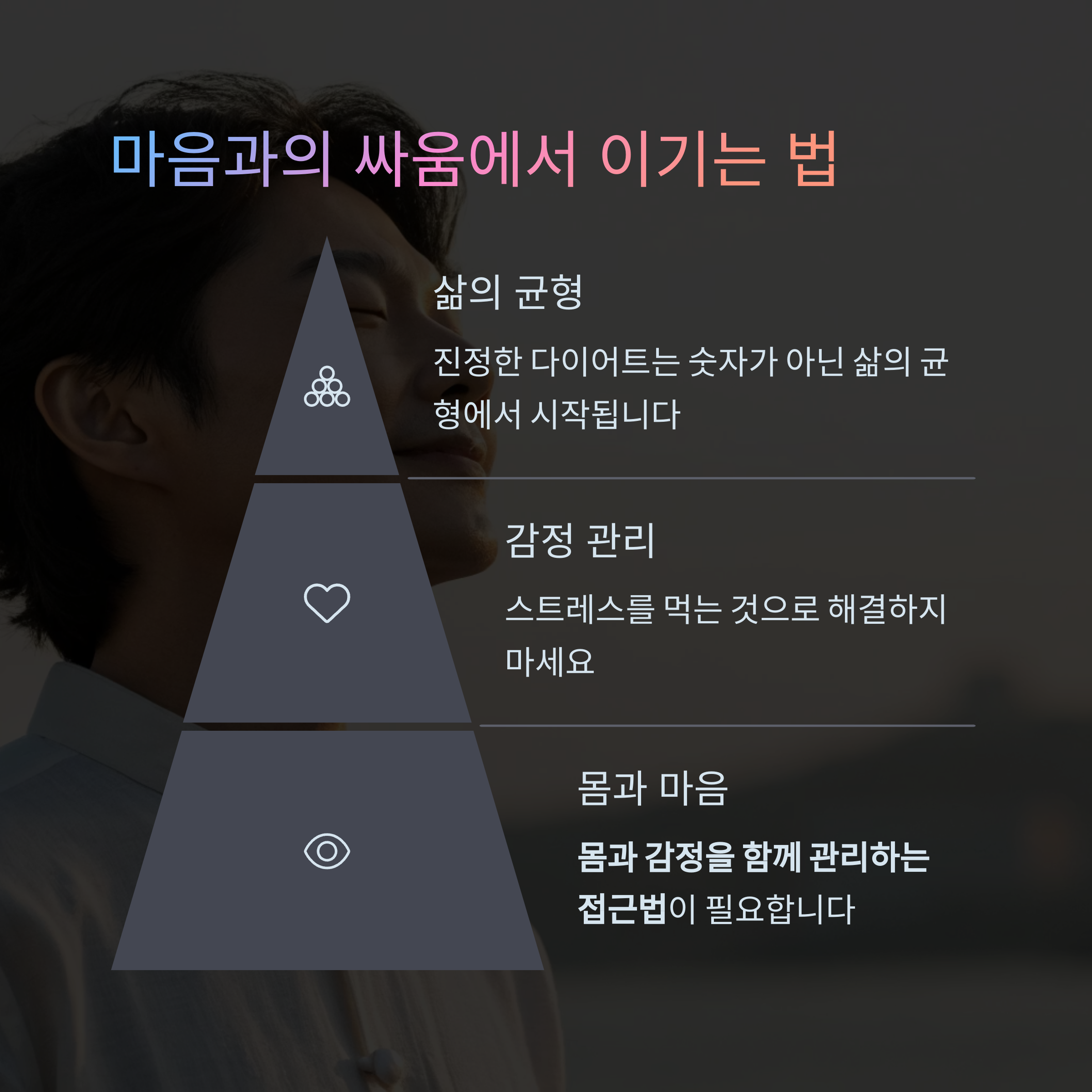 체중 감량은 단순히 먹고 안 먹는 문제가 아니라 마음과의 싸움입니다.