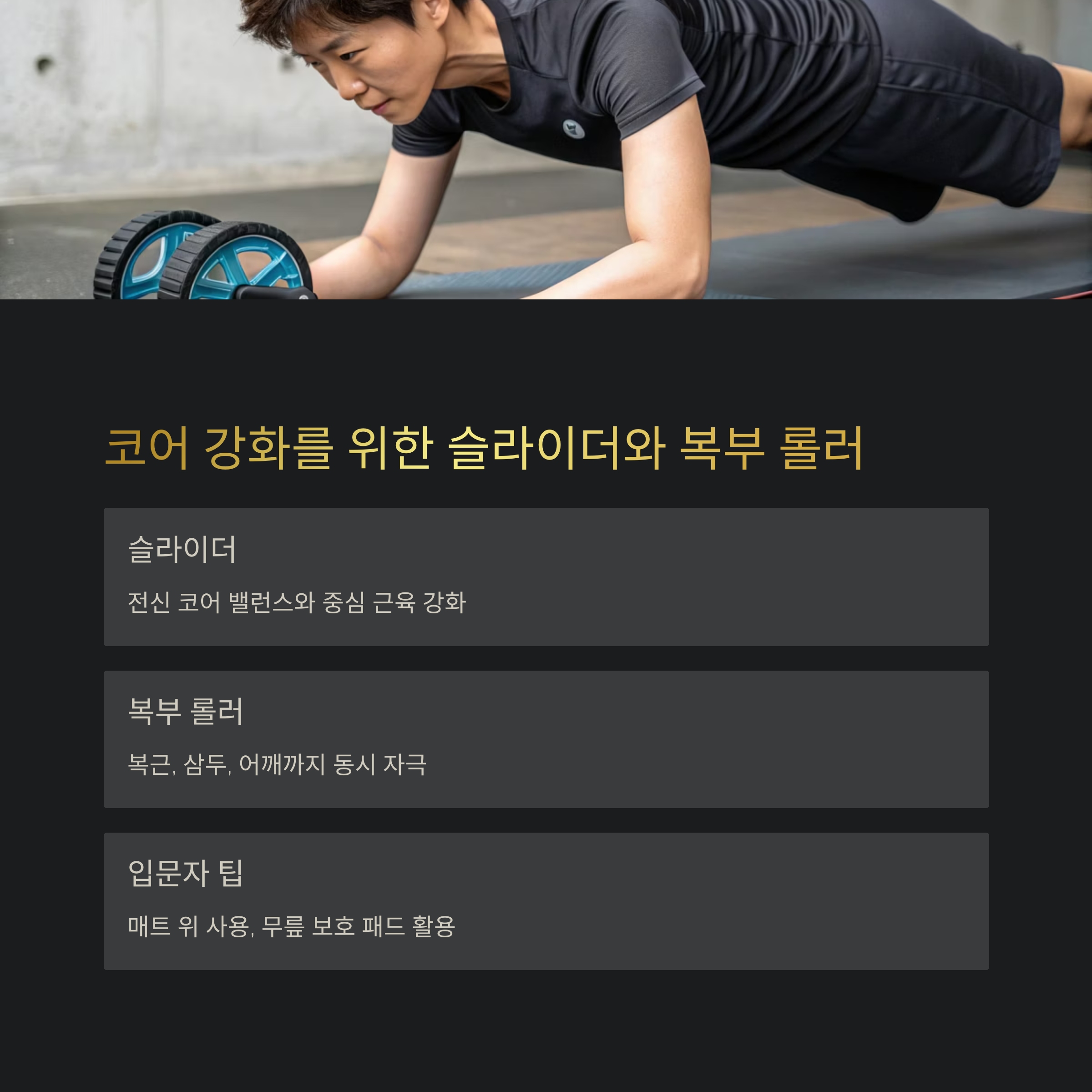 허리 안정성과 복부 근력 강화를 원한다면 슬라이더 또는 복부 롤러를 추천합니다.
