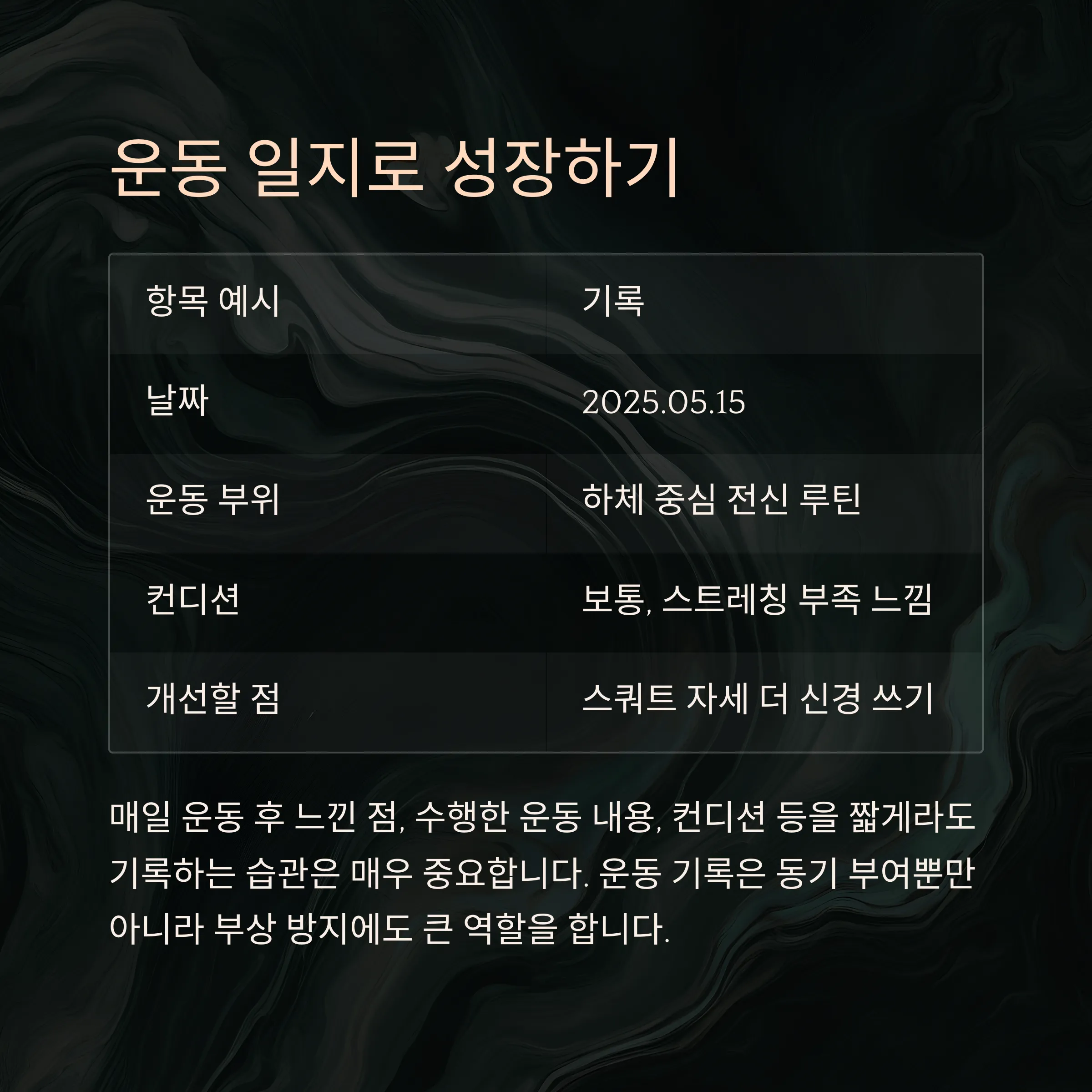매일 운동 후 느낀 점, 수행한 운동 내용, 컨디션 등을