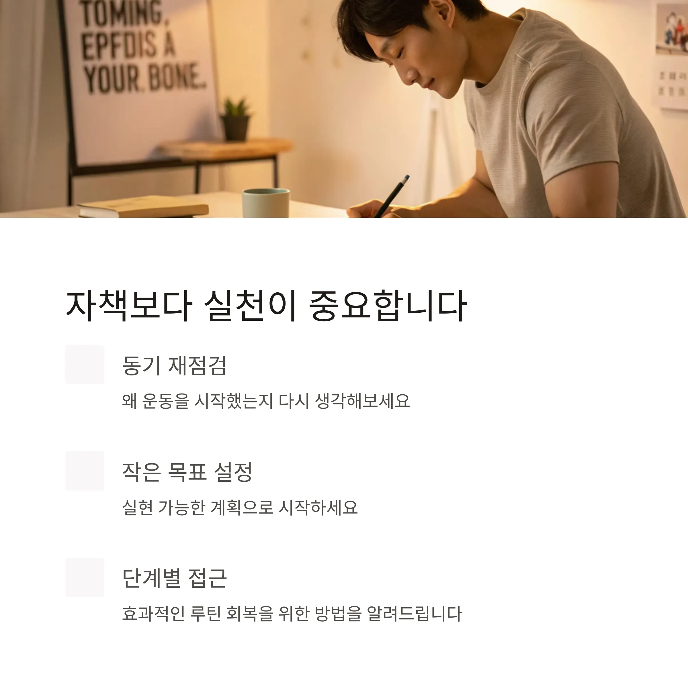 운동 루틴이 흐트러졌을 때 가장 중요한 건 자책보다 실천입니다.
