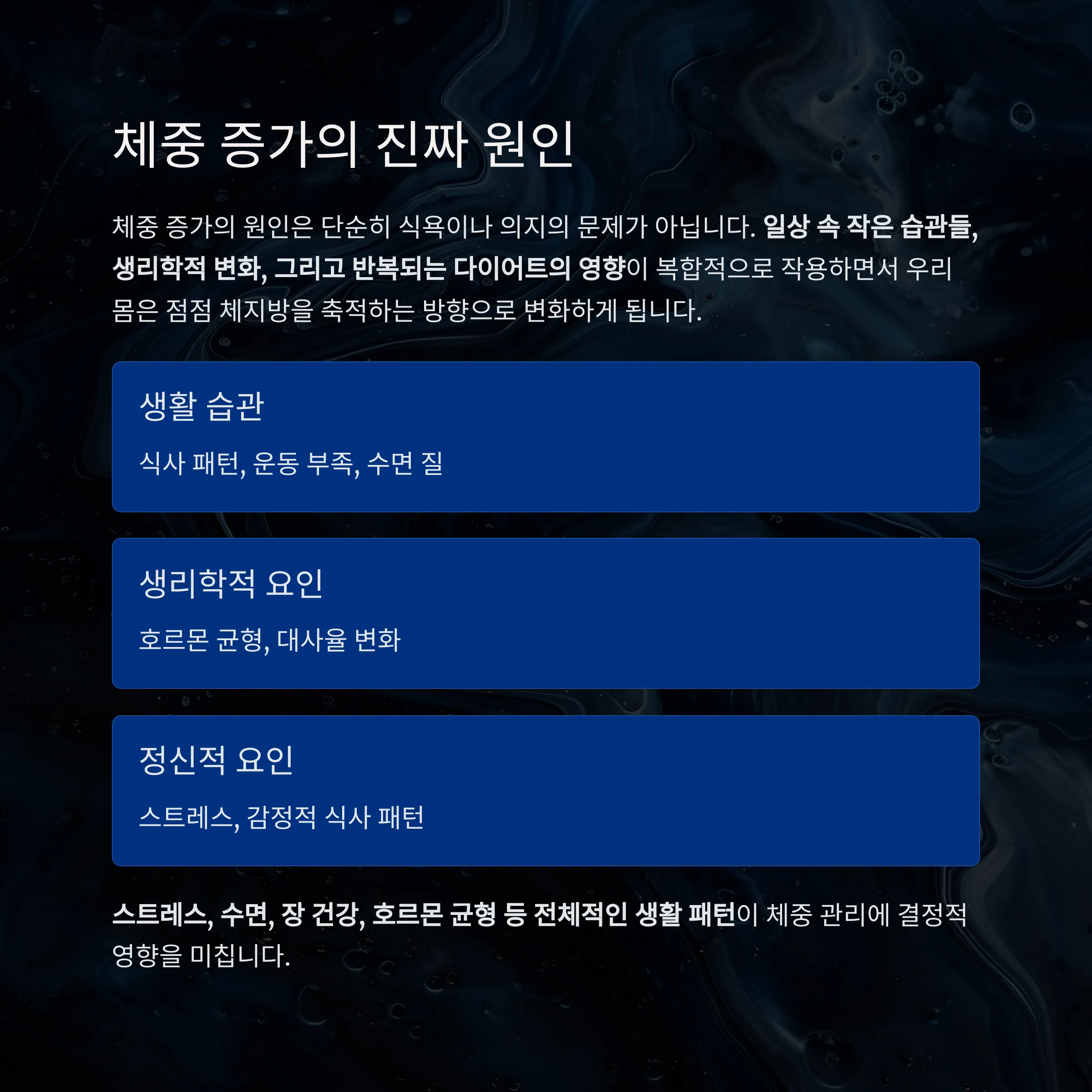 스트레스, 수면, 장 건강, 호르몬 균형 등 전체적인 생활 패턴이라는 점을 이해해야 합니다.