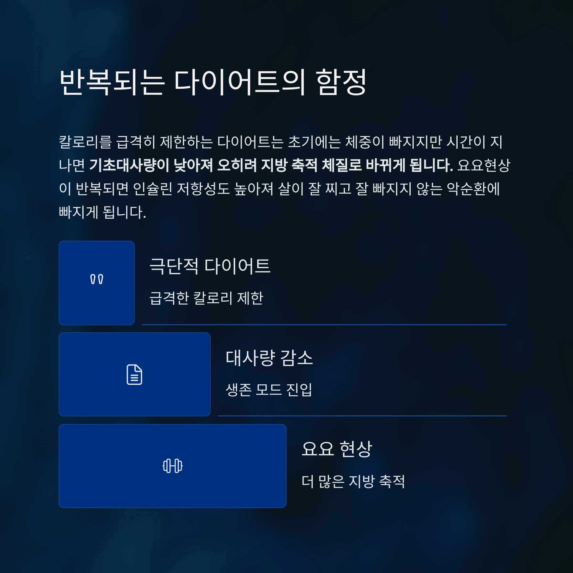 기초대사량이 낮아져 오히려 지방 축적 체질로 바뀌게 됩니다.