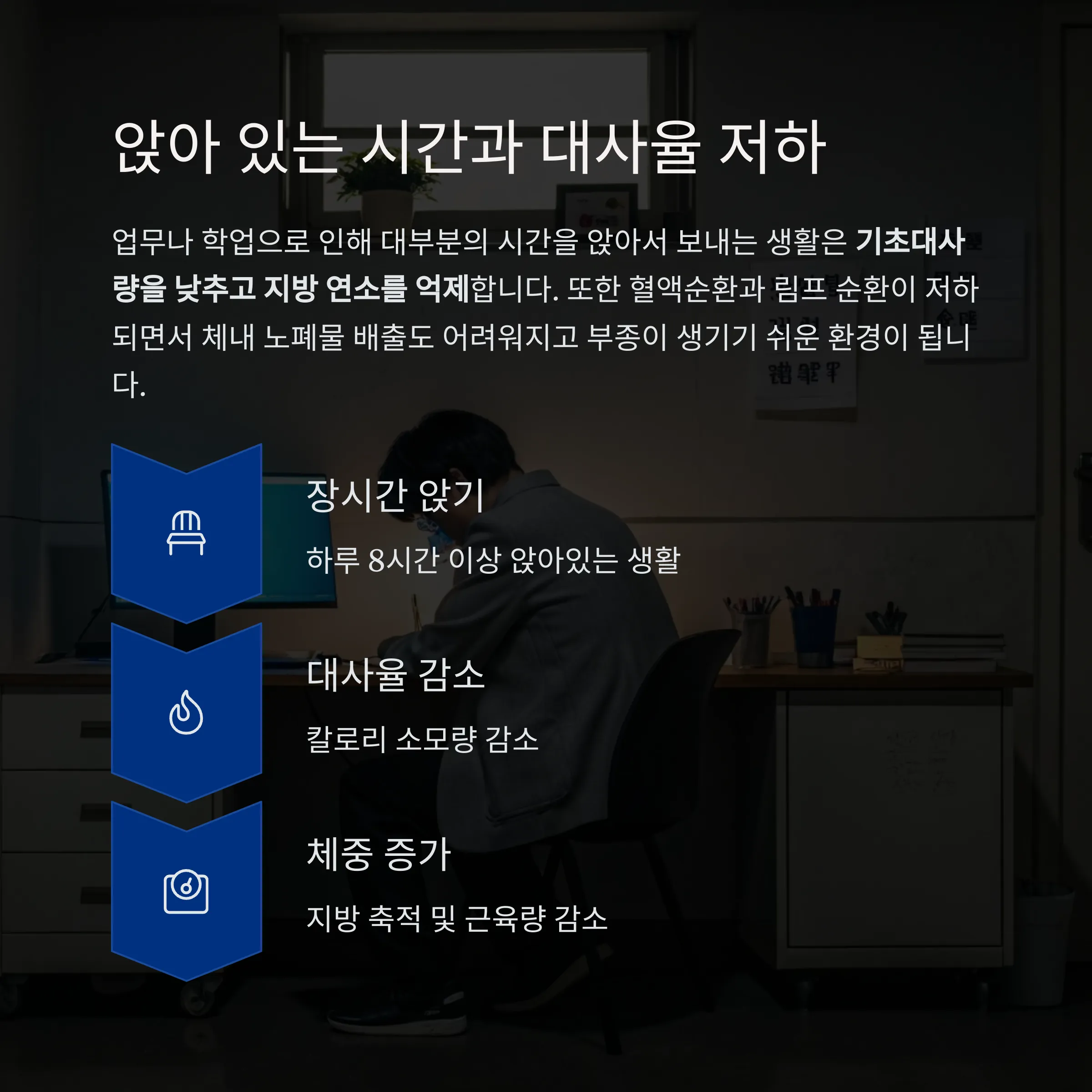 업무나 학업으로 인해 대부분의 시간을 앉아서 보내는 생활은