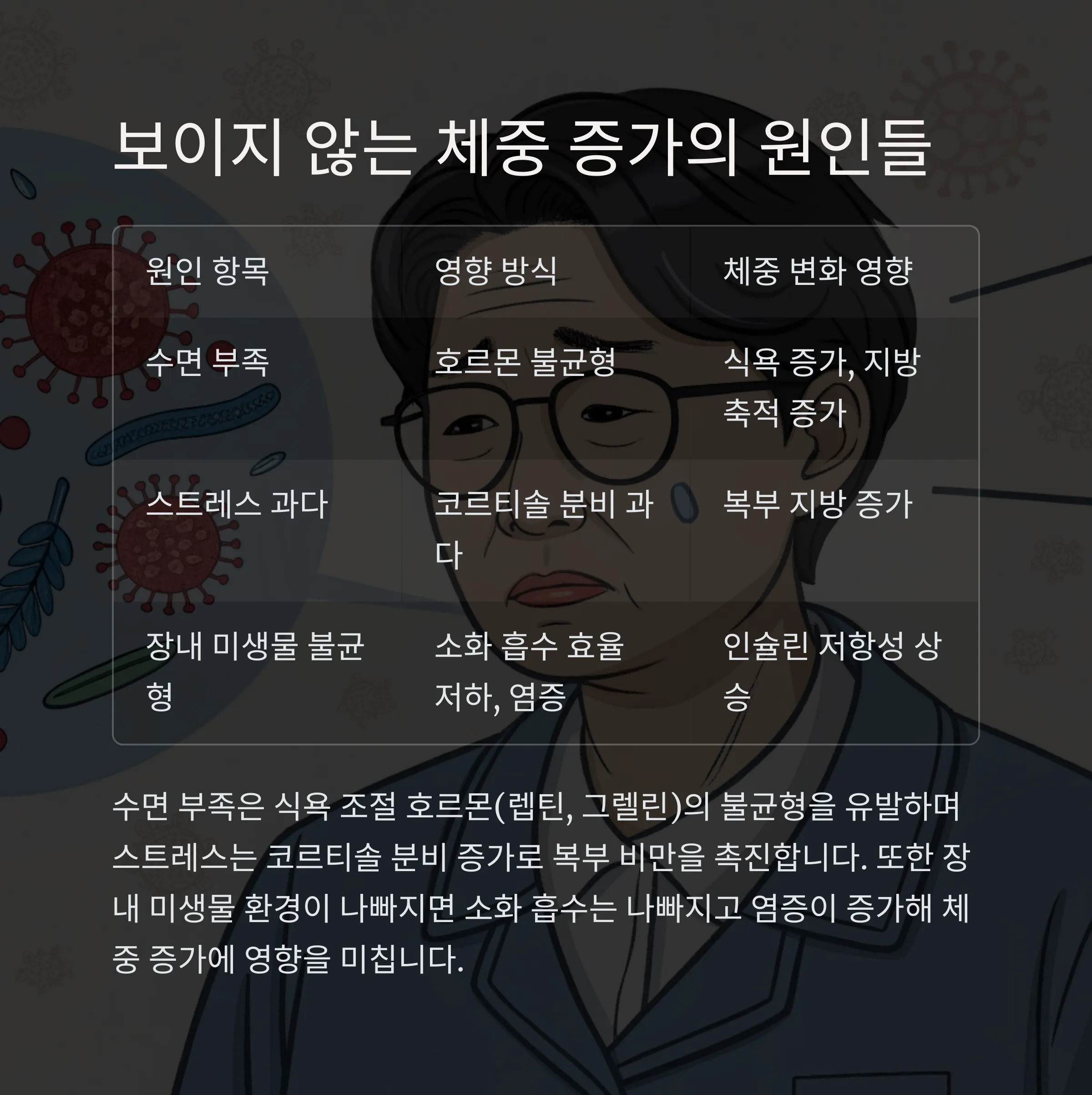 보이지 않는 체중 증가 유발자: 수면, 스트레스, 장내 미생물