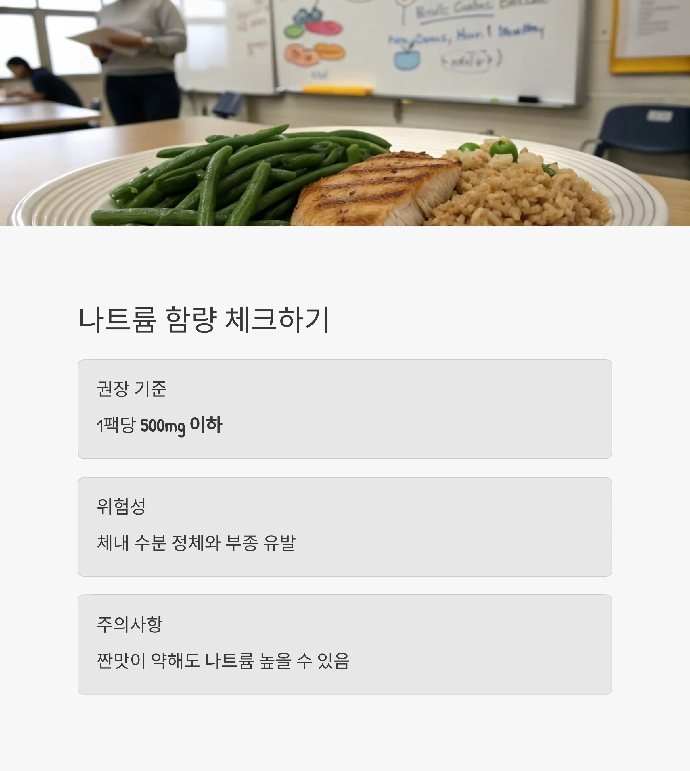 "짠맛이 강하지 않아도 나트륨 수치가 높을 수 있으니 수치를 꼭 체크하세요."