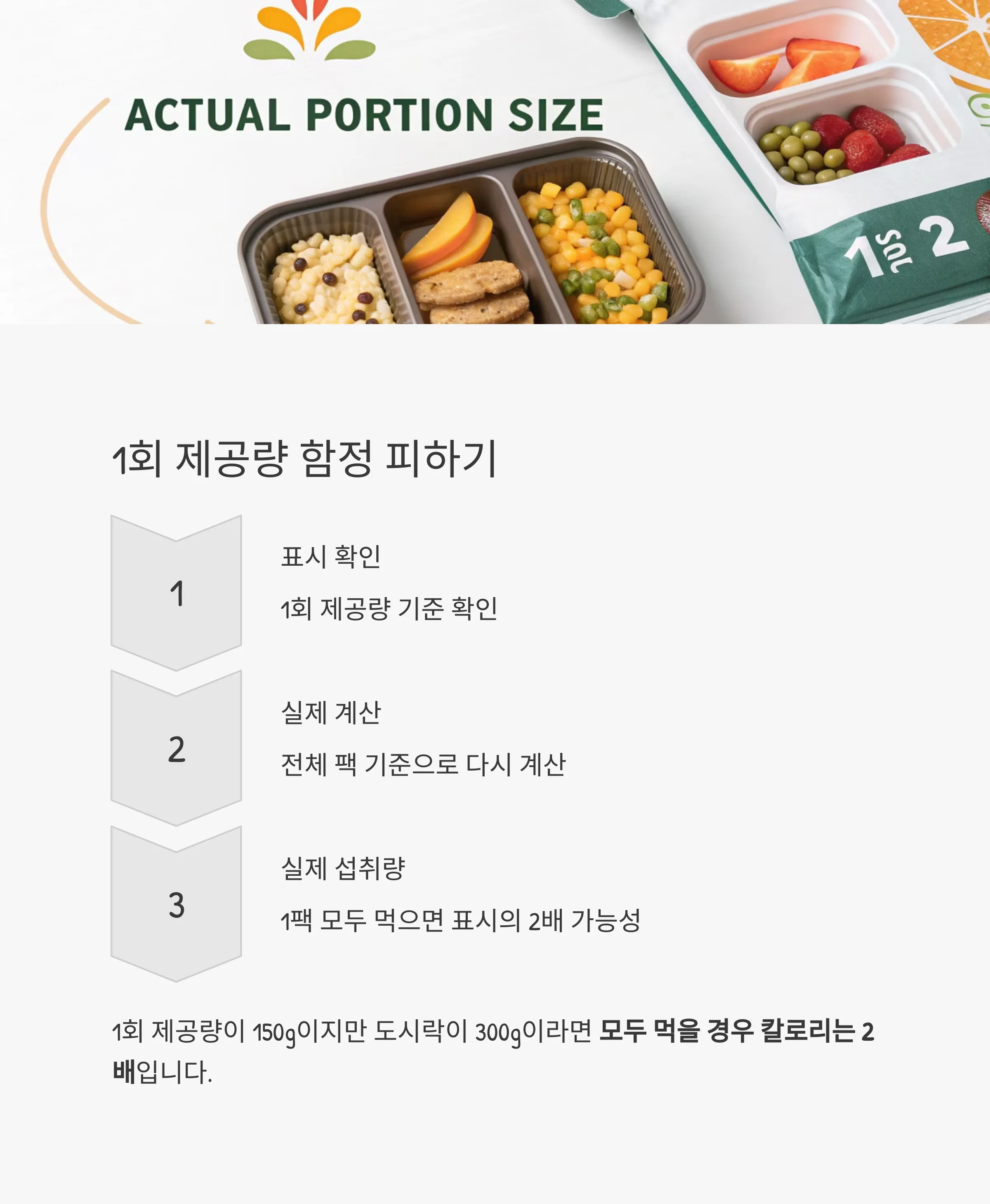 1회 제공량이 150g이지만 도시락이 300g이라면 모두 먹을 경우 칼로리는 2배입니다.