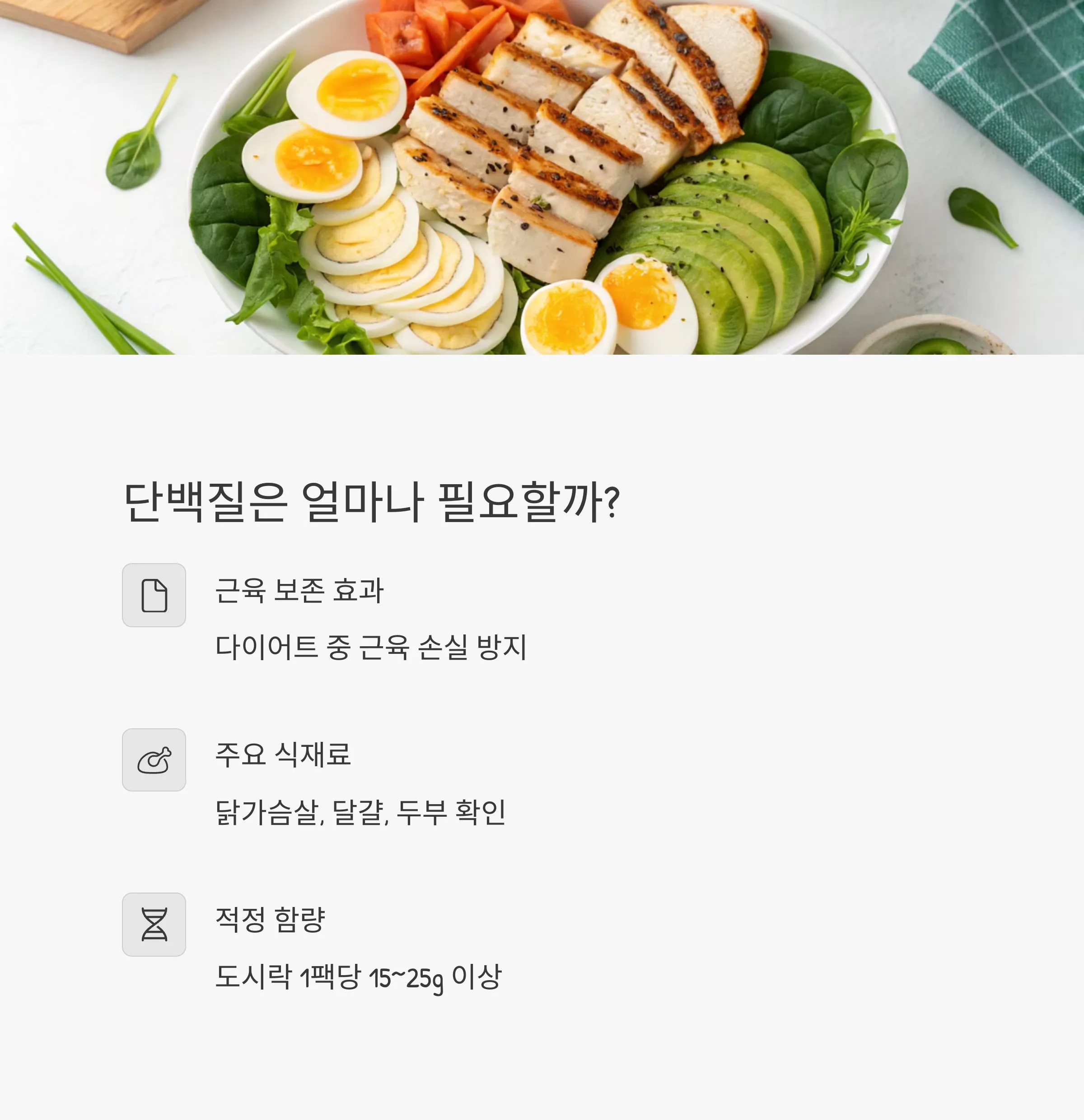 닭가슴살, 삶은 달걀, 두부 등 고단백 식재료가 포함되어야 이상적입니다.