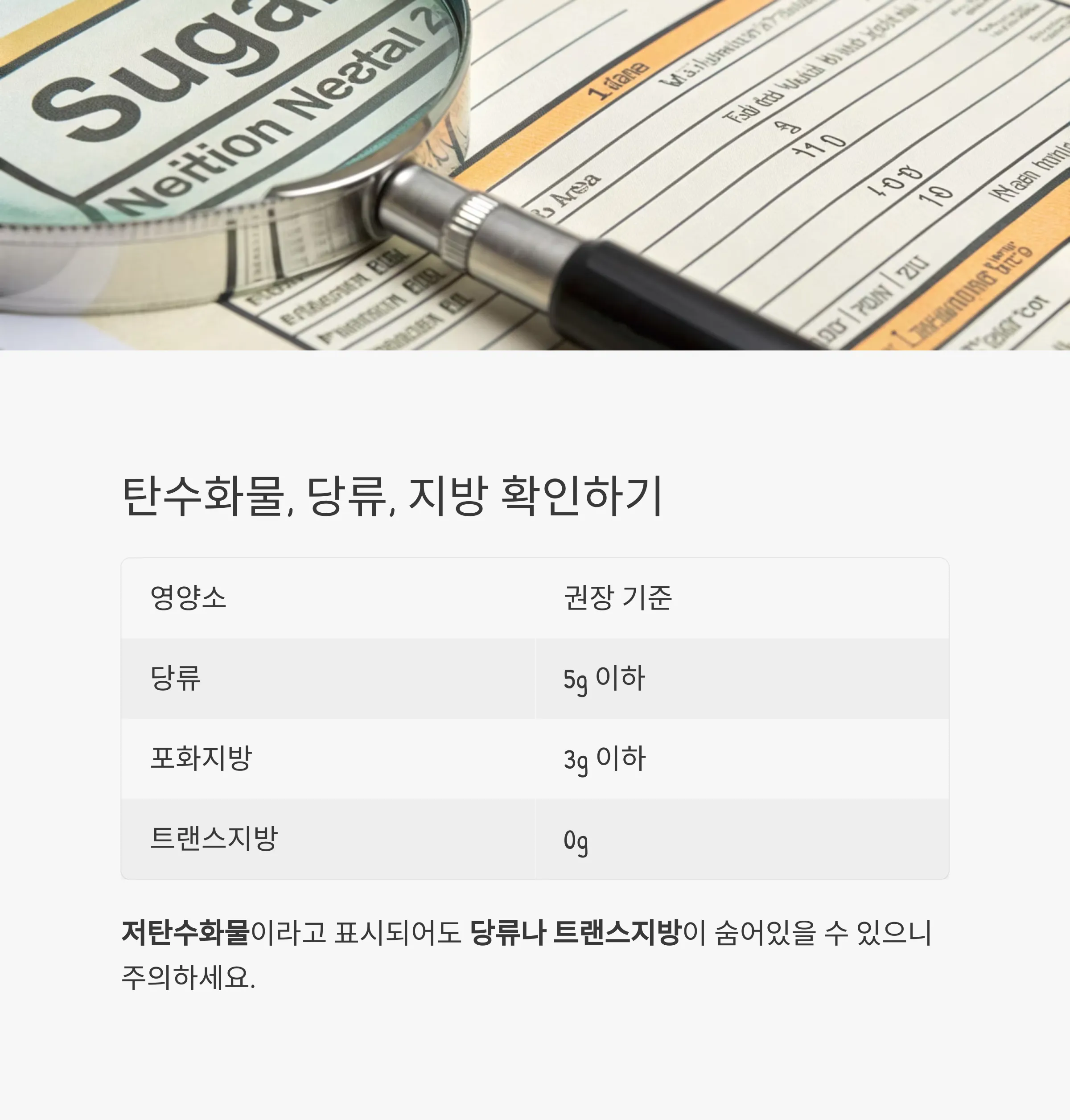 저탄수화물이라고 써 있어도 당류나 트랜스지방이 숨어 있을 수 있습니다.