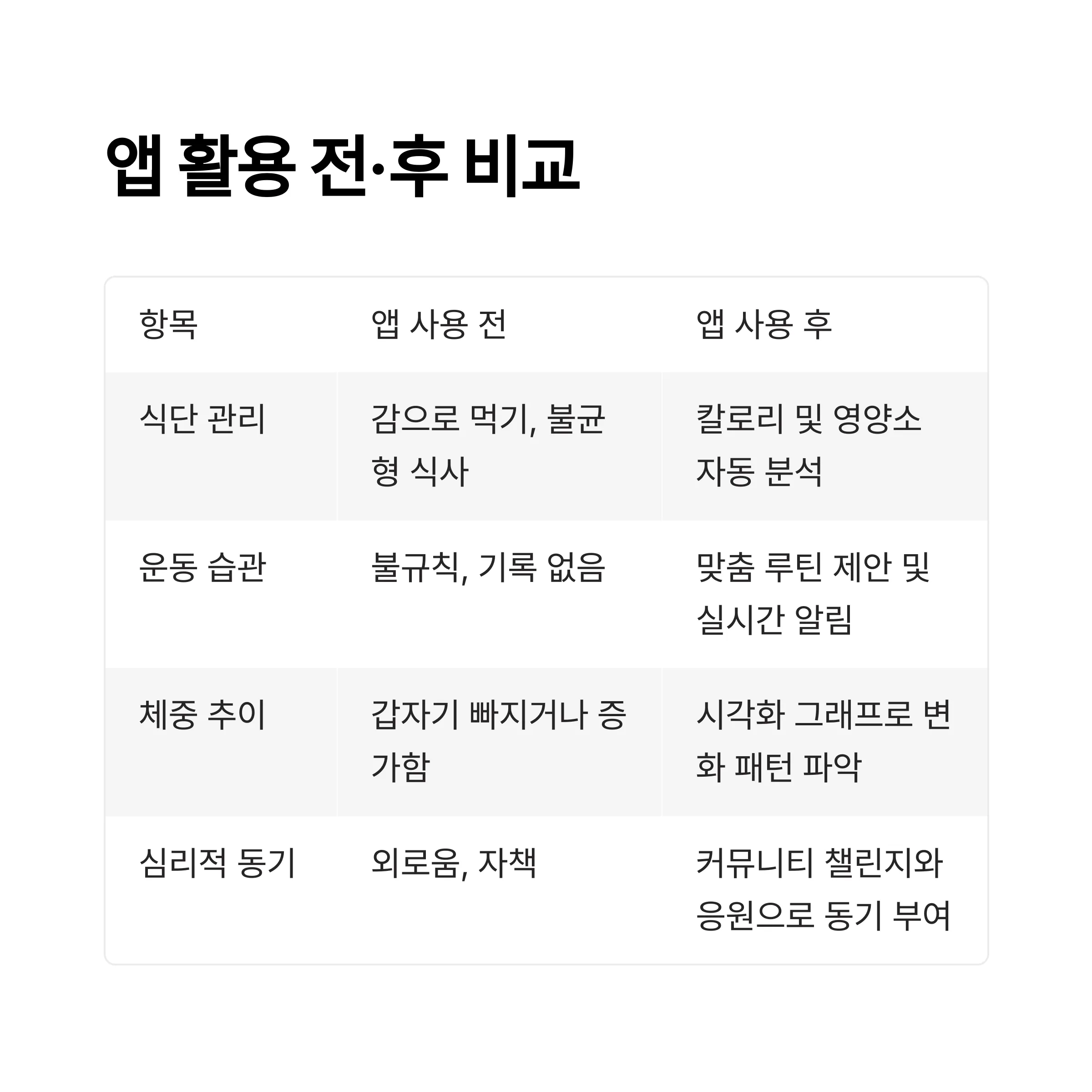 | 식단 관리 | 감으로 먹기, 불균형 식사 | 칼로리 및 영양소 자동 분석 |