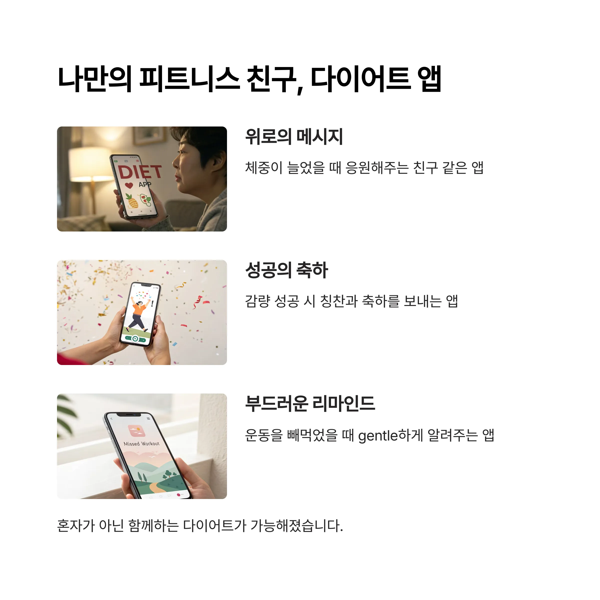 | Diet Tracker | 칼로리·운동 기록, 커뮤니티 | 직관적 UI, 초보자·직장인 추천 |