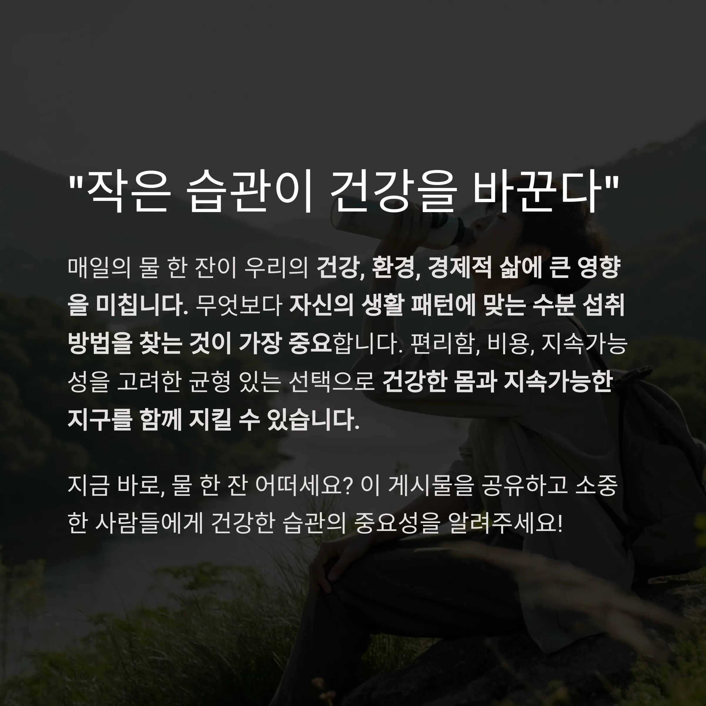 매일의 물 한 잔이 우리의 건강, 환경, 경제적 삶에 큰 영향을 미칩니다.