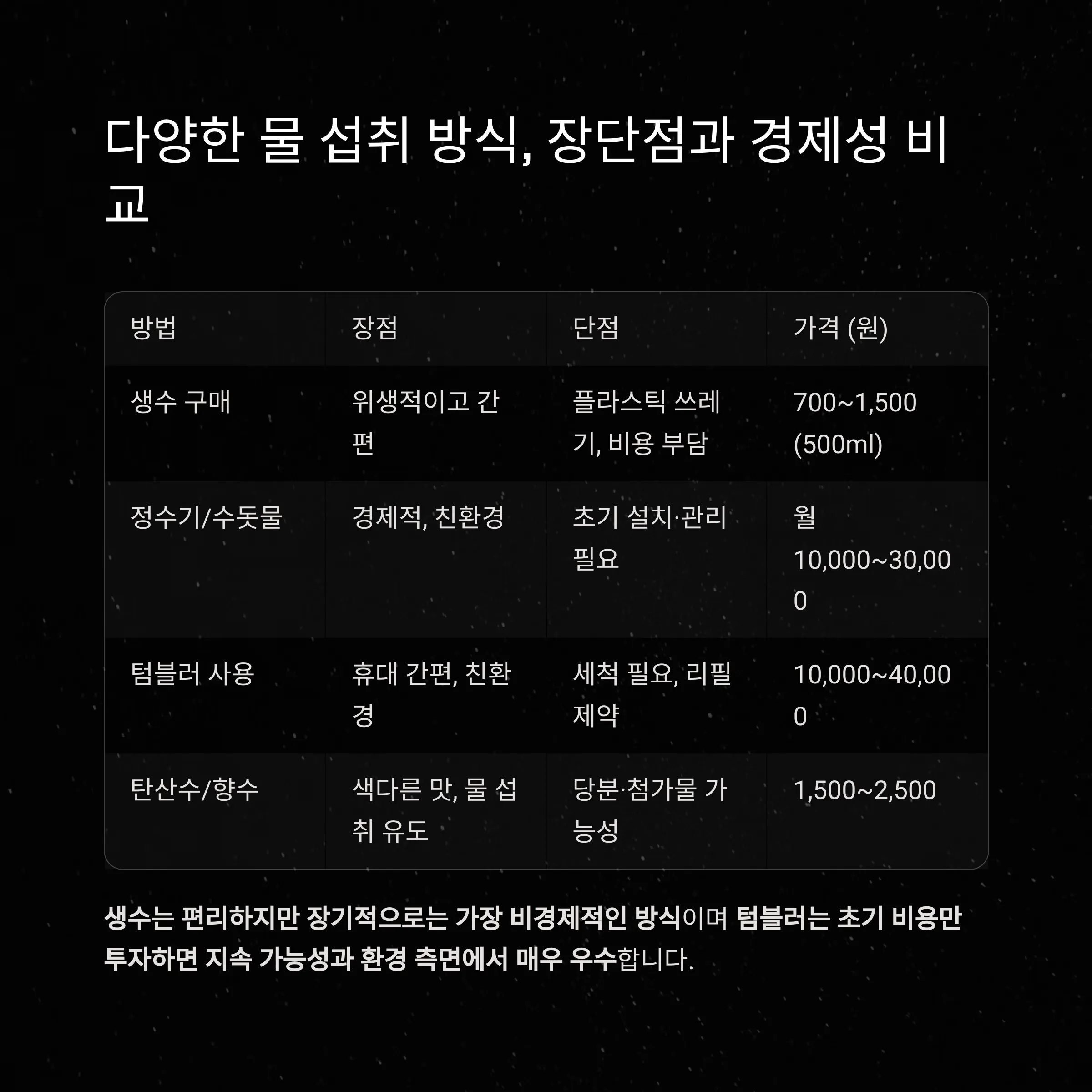 | 정수기/수돗물 | 경제적, 친환경, 지속적 사용 가능 | 초기 설치·관리 필요, 지역별 맛 이슈 | 월 10,000~30,000 |