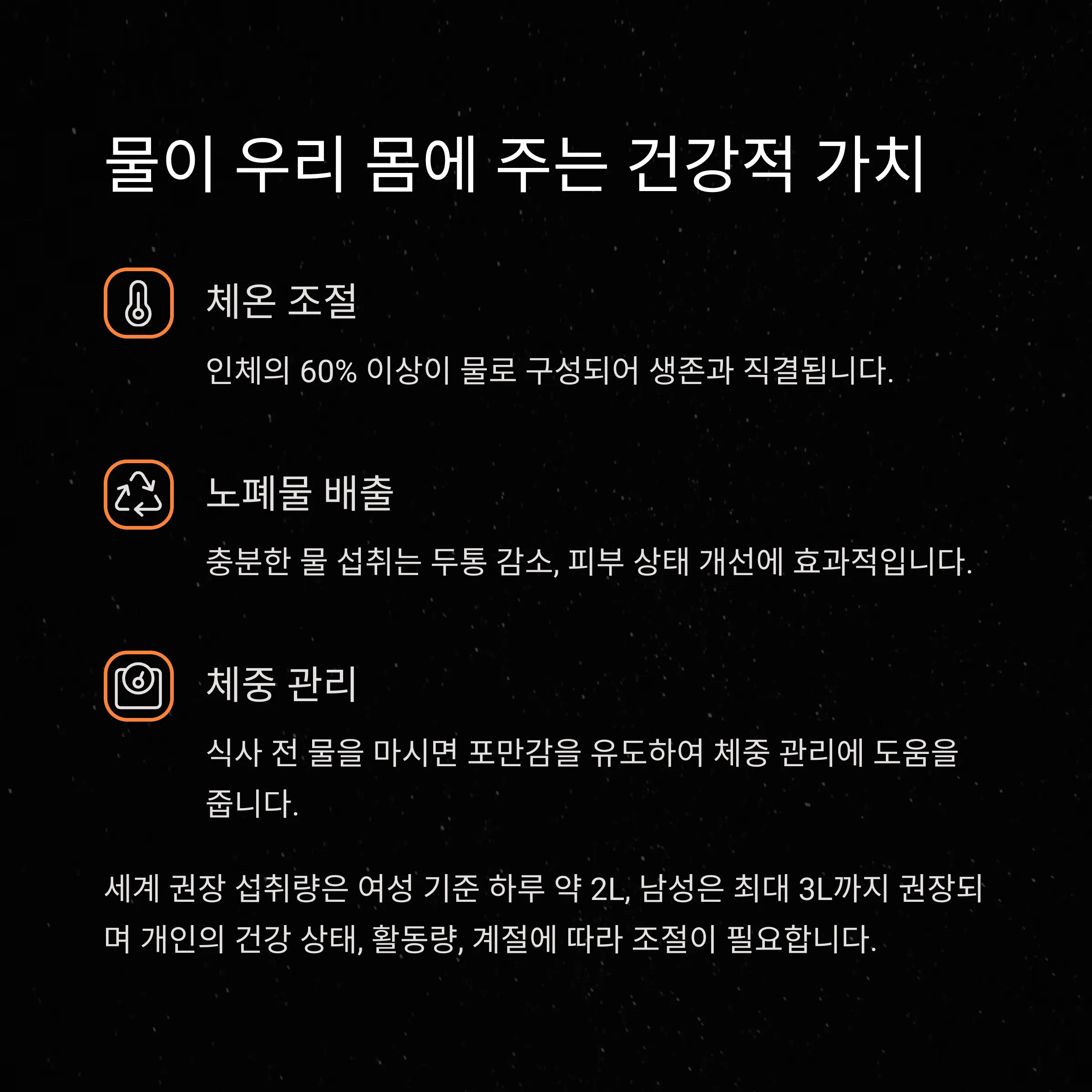 인체의 60% 이상이 물로 구성되어 있으며, 이는 생존과 직결되는 요소입니다.