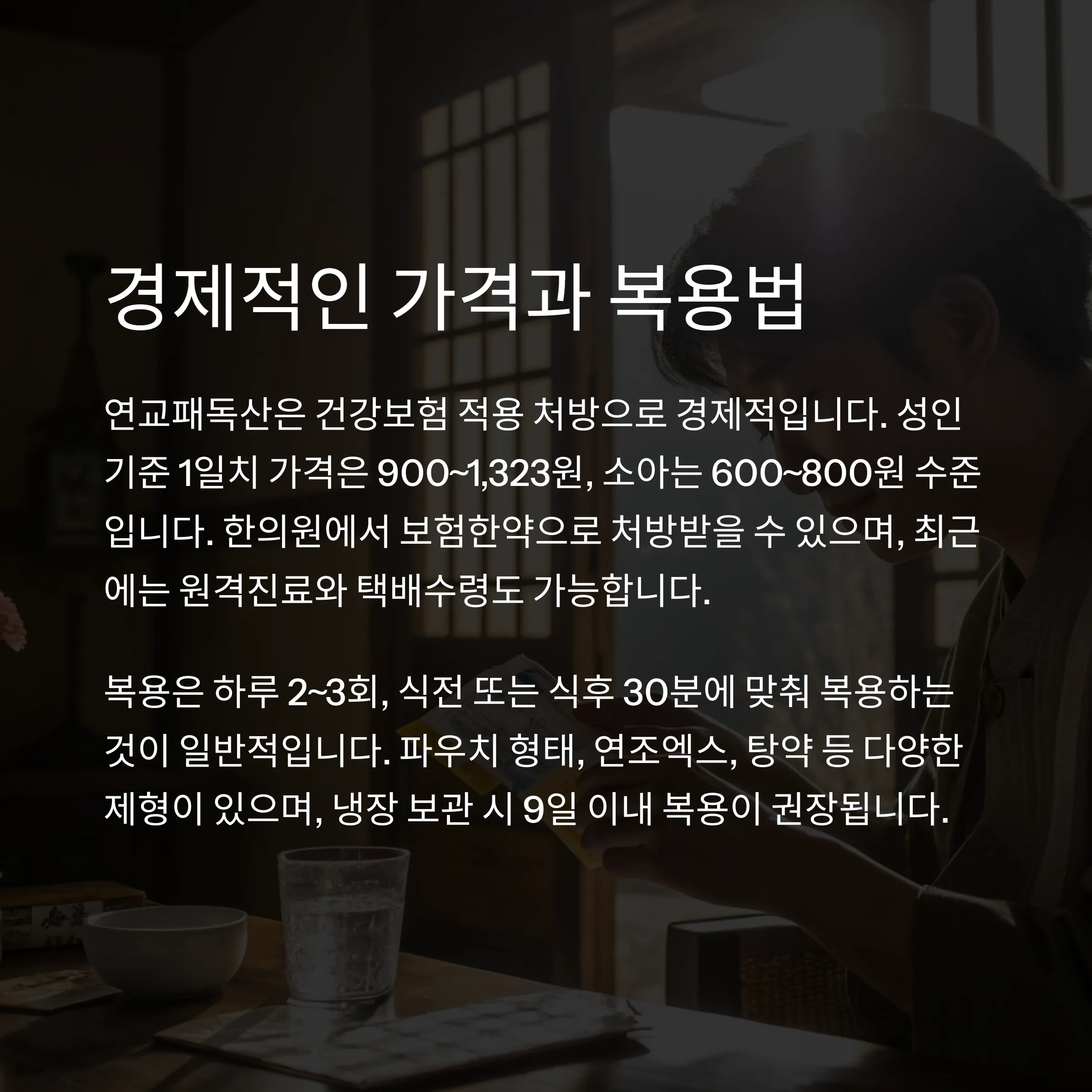 최근 코로나19 유행 이후 연교패독산 효능이 인후통 완화와 몸살 증상 개선에 널리 쓰이고 있습니다. 건강보험 적용으로 경제적 부담도 적어 많은 환자들이 선택하고 있습니다. - 염증 및 피부질환